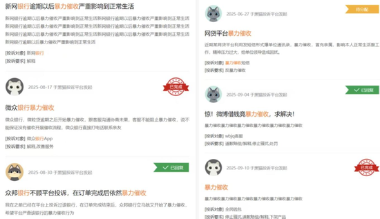 大量用户反映:网贷平台、银行信用卡中心、消金公司等金融机构,几乎都有过爆通讯录、威胁恐吓、骚扰家人、泄露隐私等暴力催收行为。